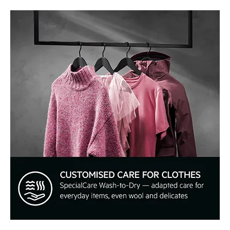 - SpecialCare Wash-to-Dry adapts to each fabric type for gentle yet effective cleaning. This Woolmark Blue certified machine washes and dries everyday items, delicates, and wool. It also restores the water protection of your outdoor garments.